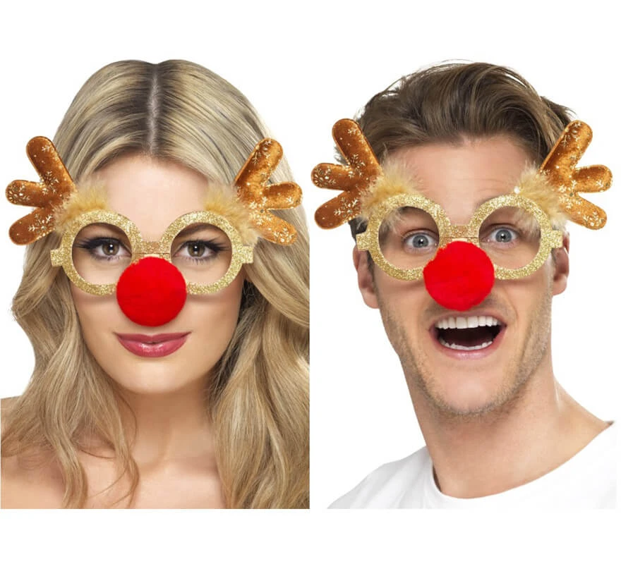 Lunettes du Renne Rudolph pour Noël. Se vendent séparement. Comprend les lunettes, Cornes et Nez rouge. Idéal pour compléter votre costume lors d’un spectacle ou du Réveillon de Noël.
